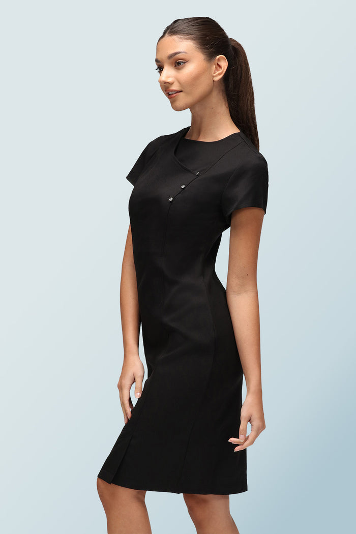 This classic wellness and beauty dress is made to provide a professional, sophisticated look. Features three faux crystal buttons for a touch of sparkle. Because you deserve a uniform that shines like you do.