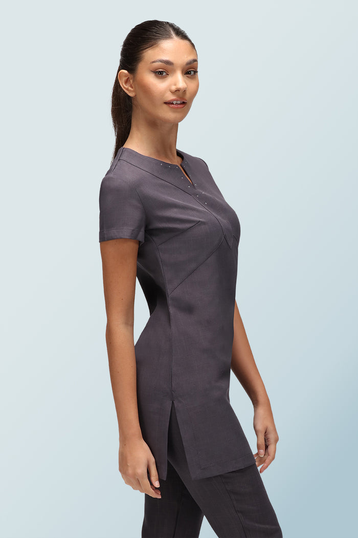 This embellished wellness and beauty tunic is designed with a unique notch neckline for sophistication and style, featuring subtle diamante detailing for a touch of sparkle. Because you deserve a uniform that shines like you do.