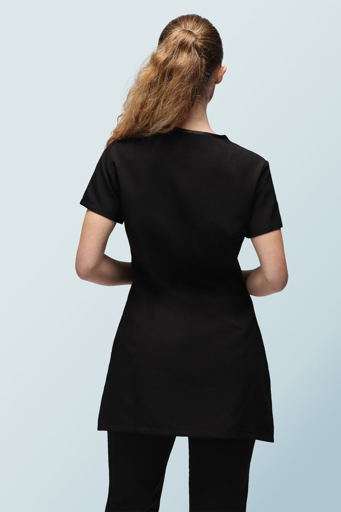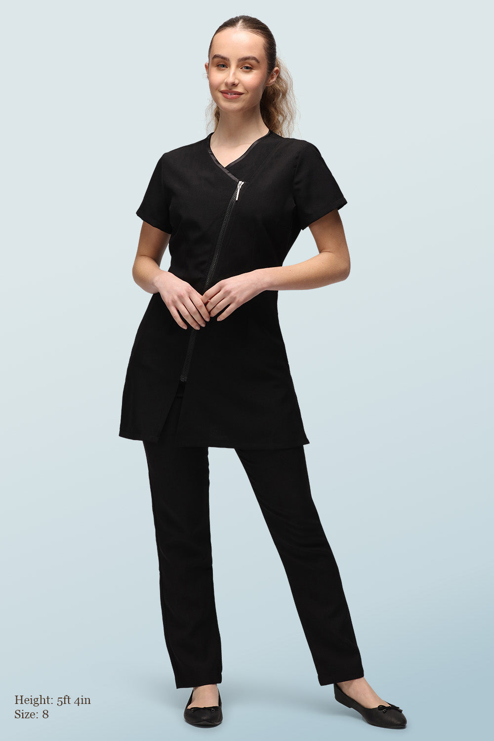 This flattering wellness and beauty tunic is designed with an asymmetrical contrast collar and zip. Choose from five stylish accent seam options that best pairs with your visual brand identity.