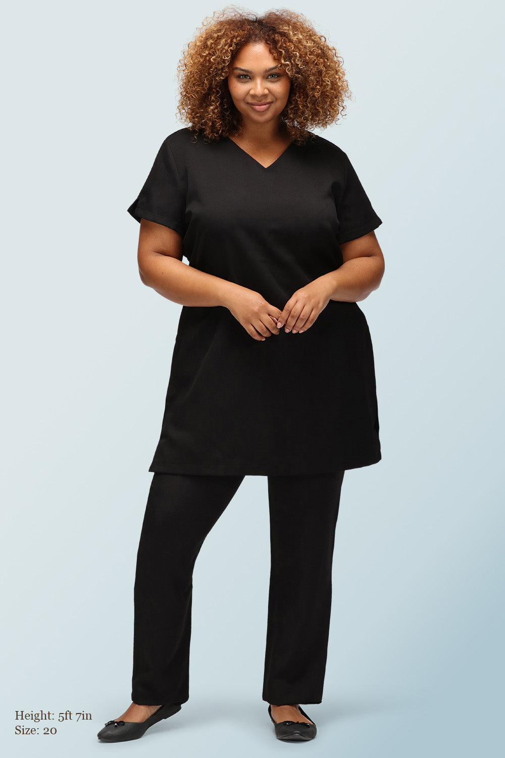 This sleek beauty and wellness tunic is designed with a longer length for modesty and confidence, featuring two handy side pockets for practicality and style. Effortlessly pair with either trousers or leggings for your perfect look.