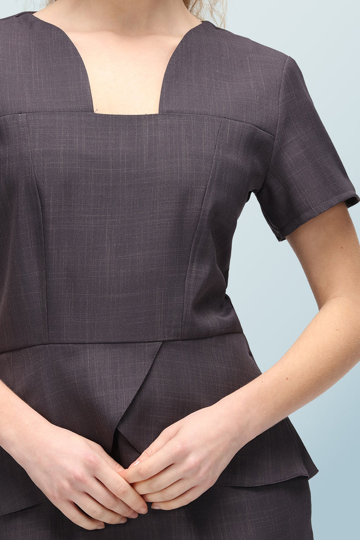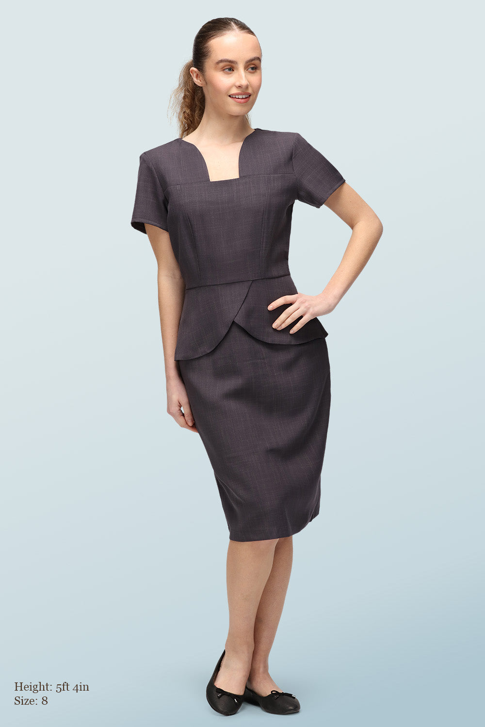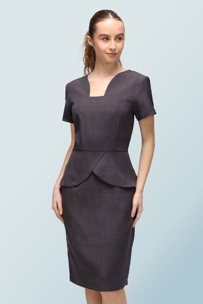 This elegant wellness and beauty dress is designed with a contemporary curved neckline, featuring a peplum waist detail to flatter your physique and bring you all day confidence. Because you deserve to feel your best, all shift long.