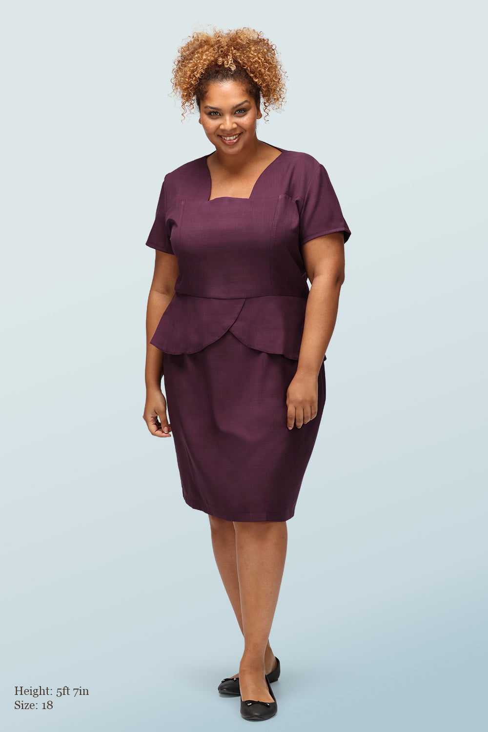 This elegant wellness and beauty dress is designed with a contemporary curved neckline, featuring a peplum waist detail to flatter your physique and bring you all day confidence. Because you deserve to feel your best, all shift long.
