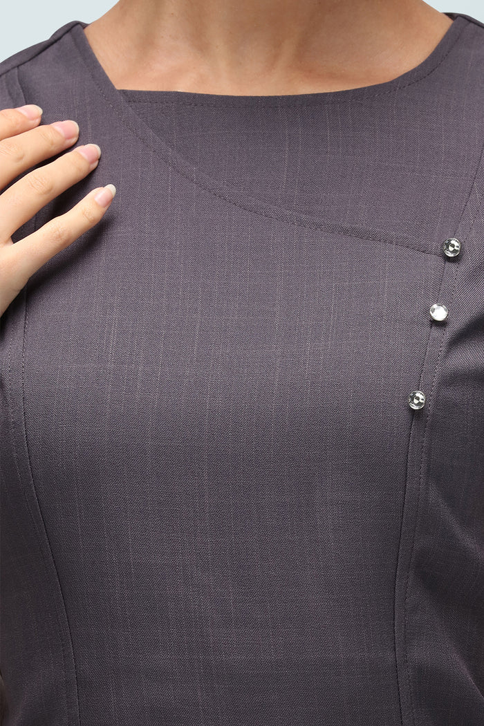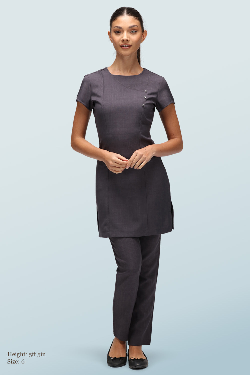 This flattering wellness and beauty tunic is designed with a longer length for modesty and confidence. Pair easily with trousers or leggings. Features three faux crystal buttons for a touch of sparkle and style.