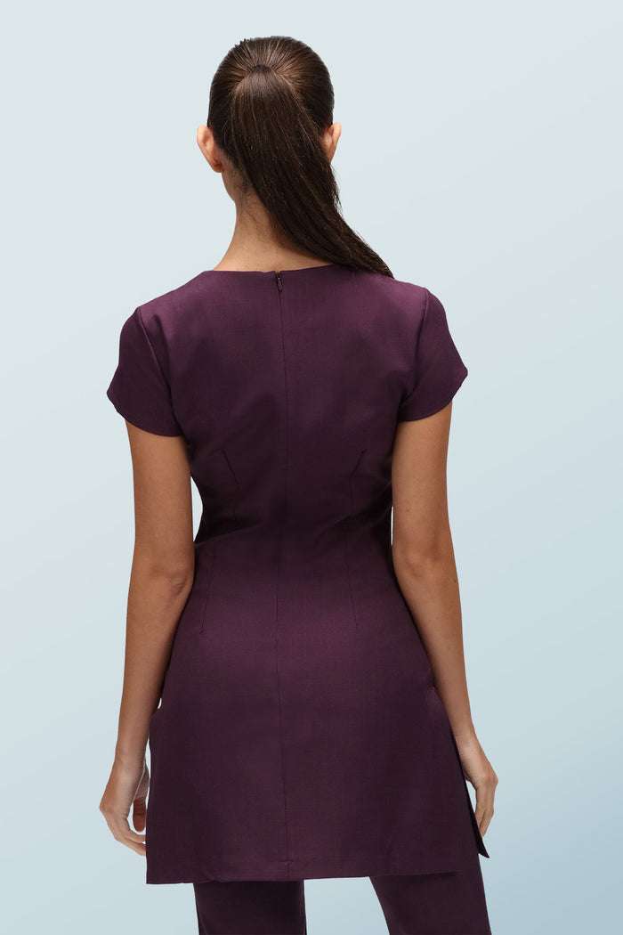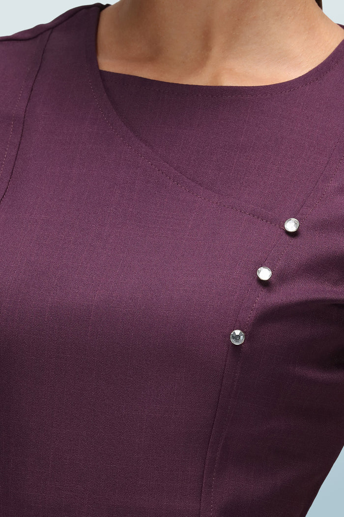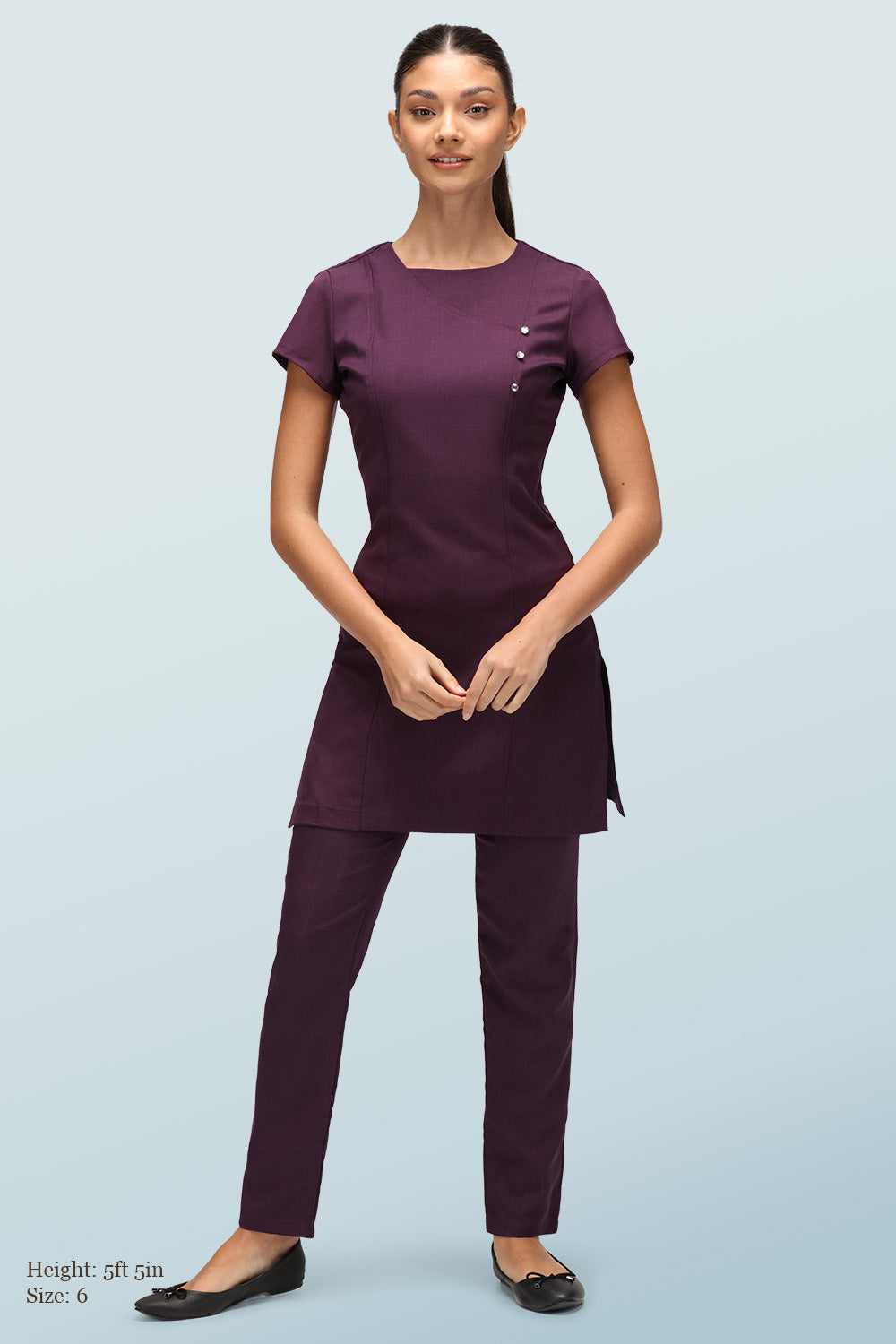 This flattering wellness and beauty tunic is designed with a longer length for modesty and confidence. Pair easily with trousers or leggings. Features three faux crystal buttons for a touch of sparkle and style.