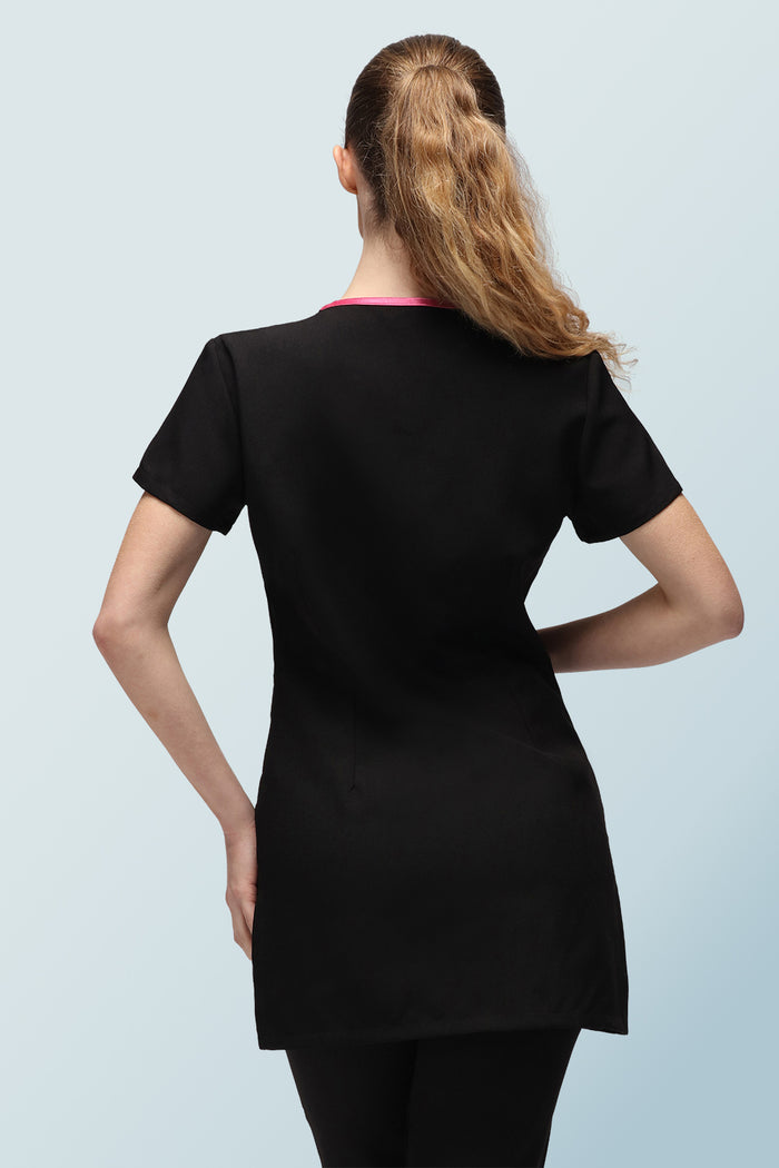 This flattering wellness and beauty tunic is designed with an asymmetrical contrast collar and zip. Choose from five stylish accent seam options that best pairs with your visual brand identity.