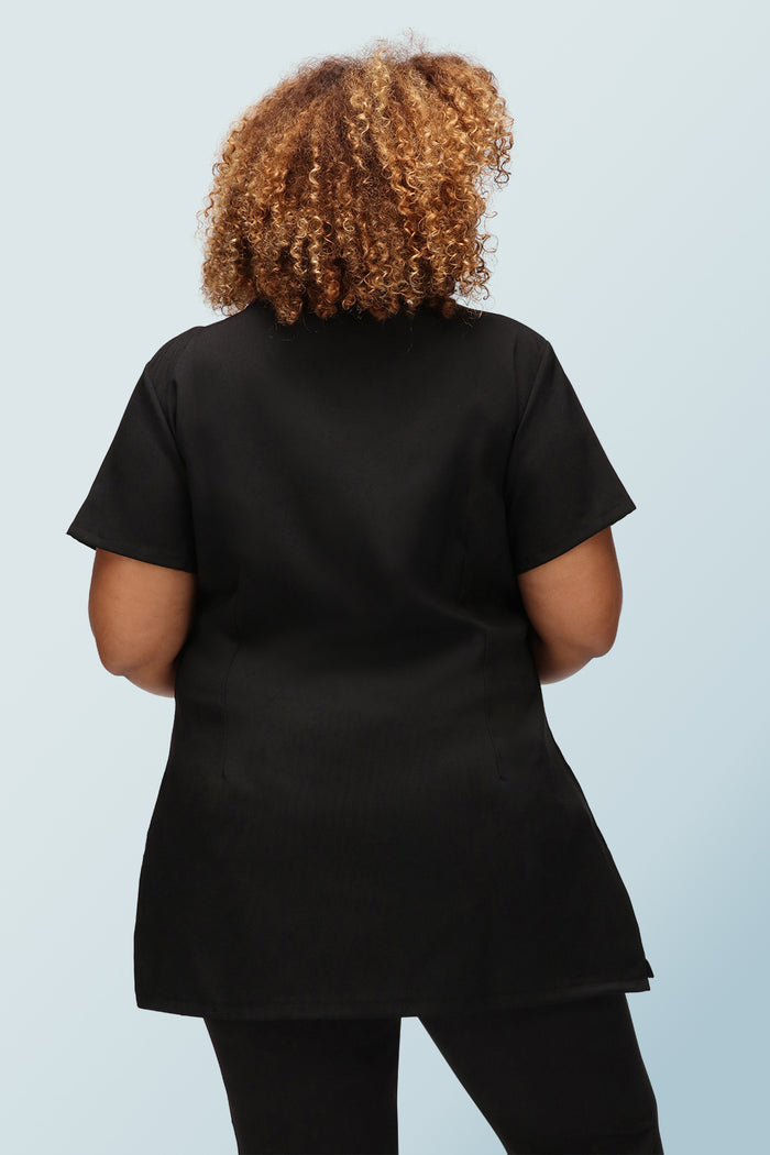 This flattering wellness and beauty tunic is designed with an asymmetrical contrast collar and zip. Choose from five stylish accent seam options that best pairs with your visual brand identity.