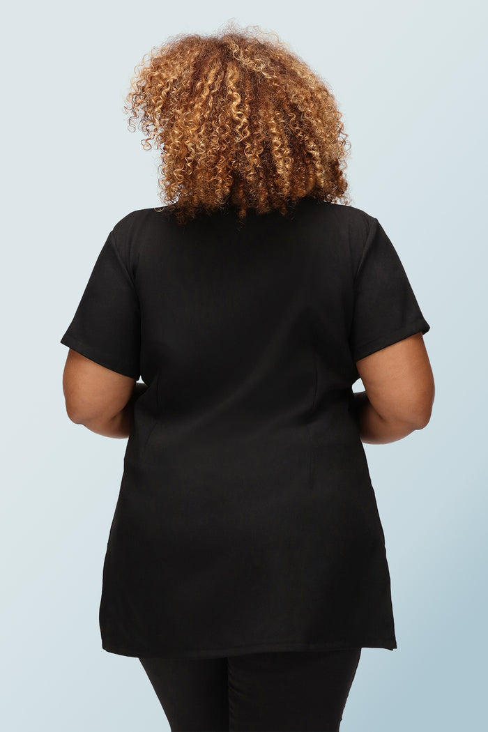 This flattering wellness and beauty tunic is designed with an asymmetrical contrast collar and zip. Choose from five stylish accent seam options that best pairs with your visual brand identity.