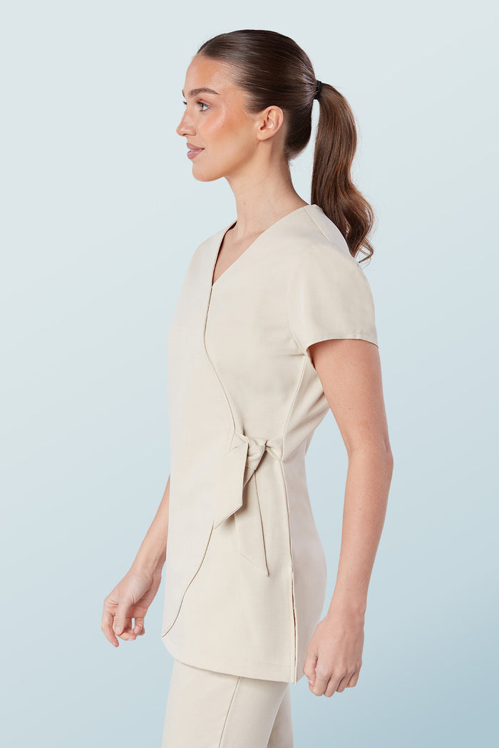 This best-selling wellness and beauty tunic features a faux crossover for practicality and to keep you feeling secure. Its side tie can be fastened in a bow or a knot. Because you deserve to feel your best, all shift long.