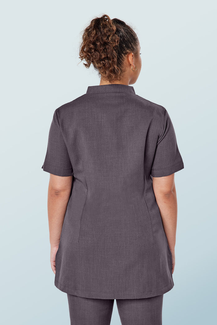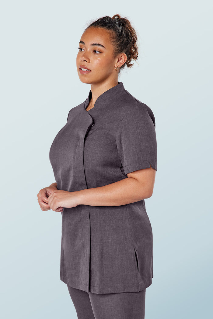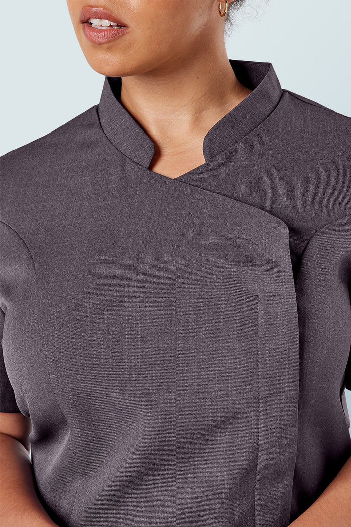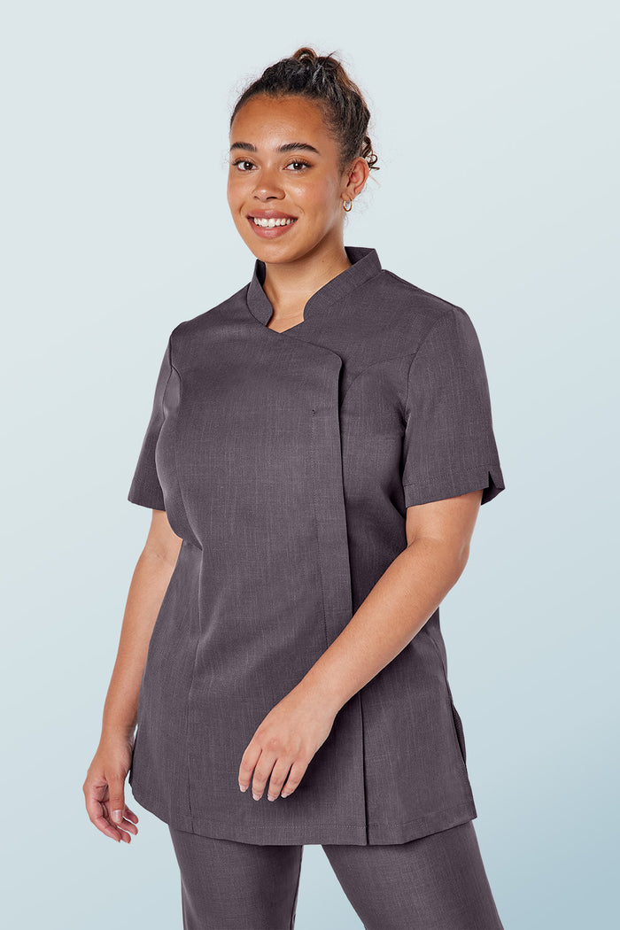 This unique wellness and beauty tunic is designed with a stylish mandarin collar, featuring a flattering asymmetrical crossover design and a hidden front zip closure. Because confidence is all in the considered details.