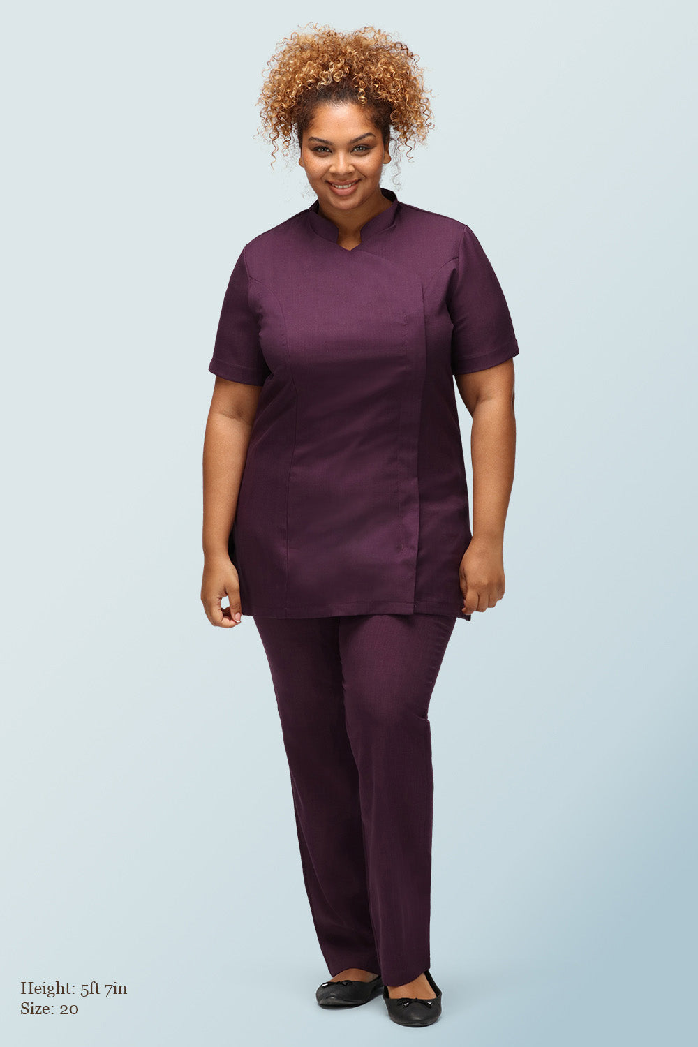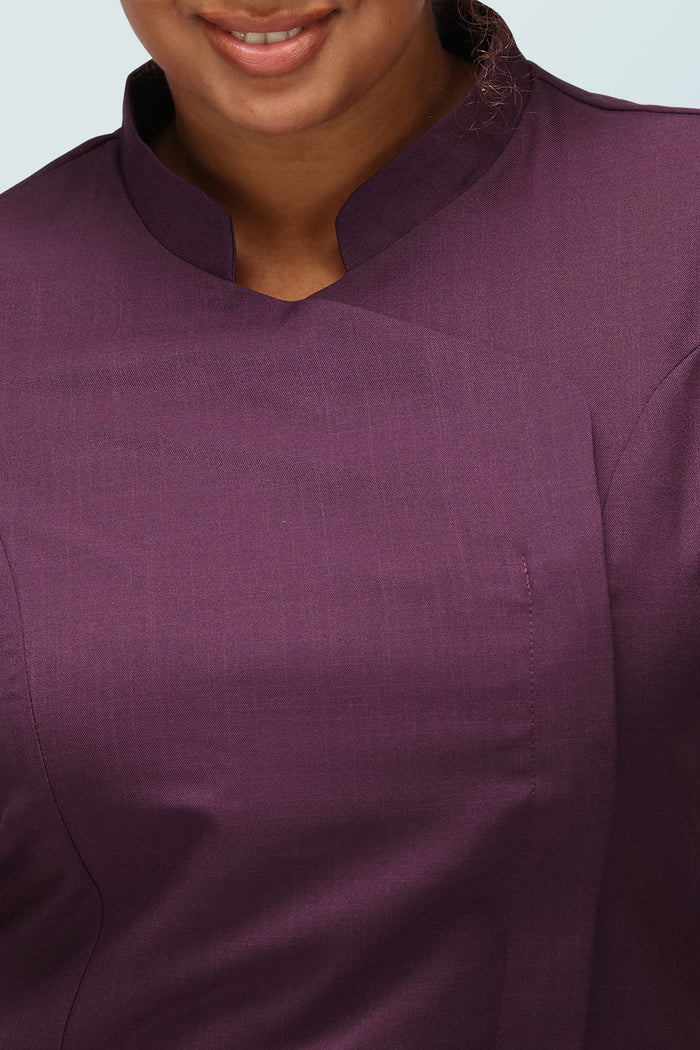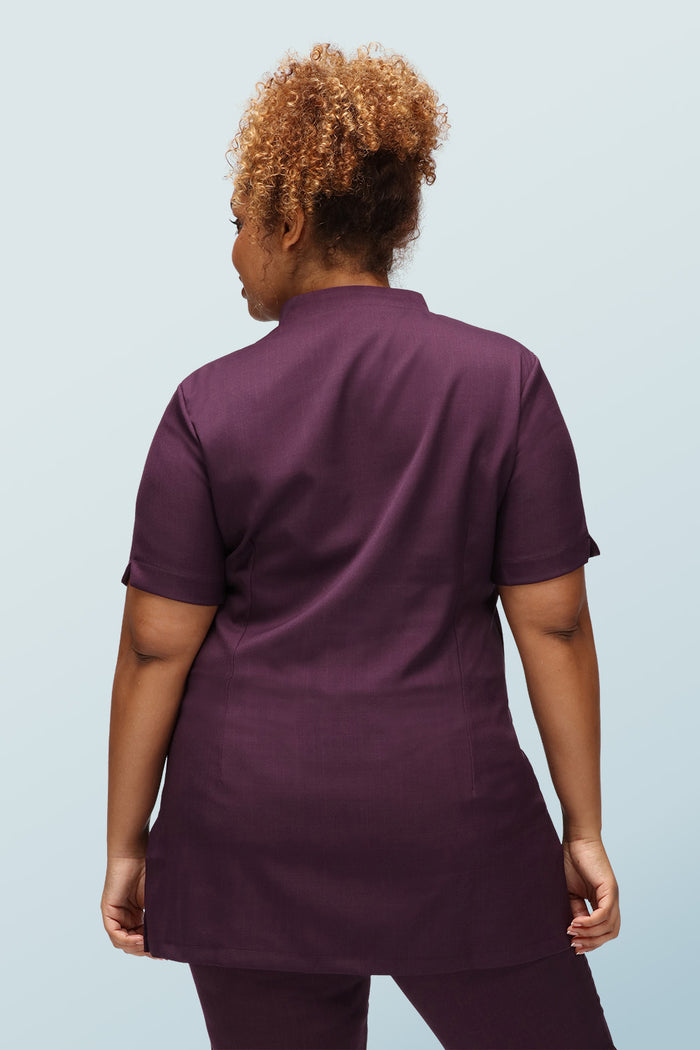 This unique wellness and beauty tunic is designed with a stylish mandarin collar, featuring a flattering asymmetrical crossover design and a hidden front zip closure. Because confidence is all in the considered details.