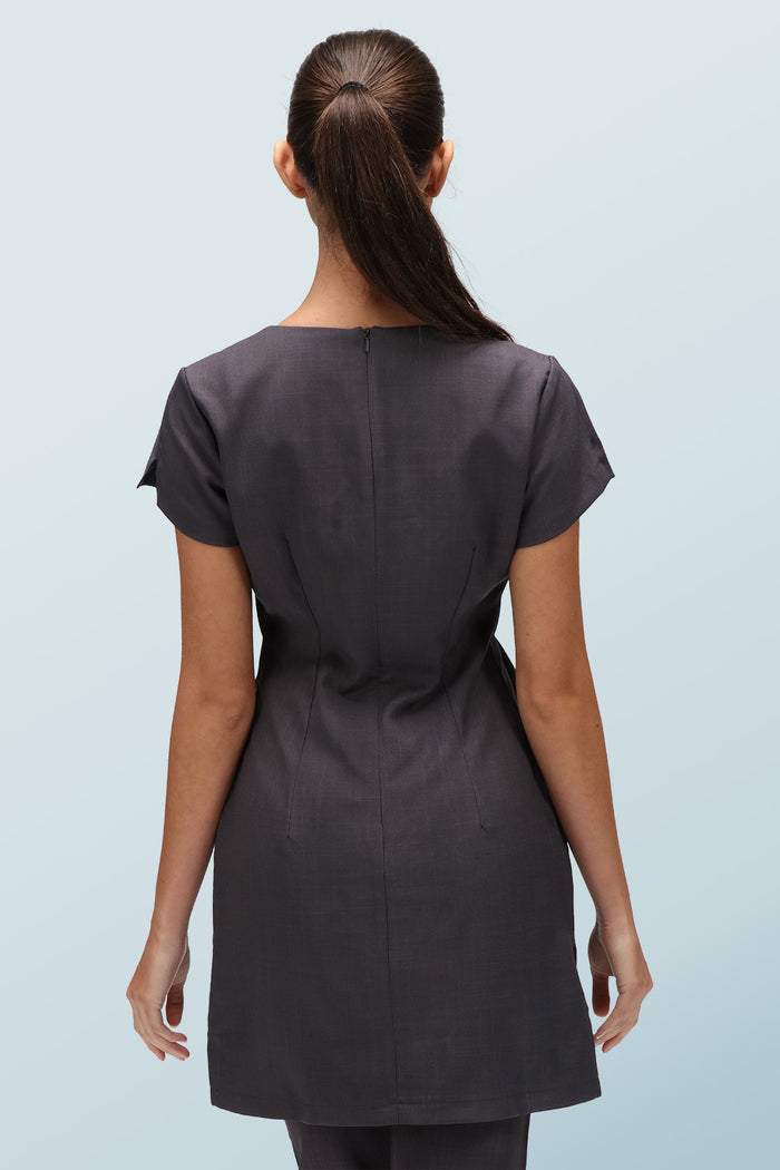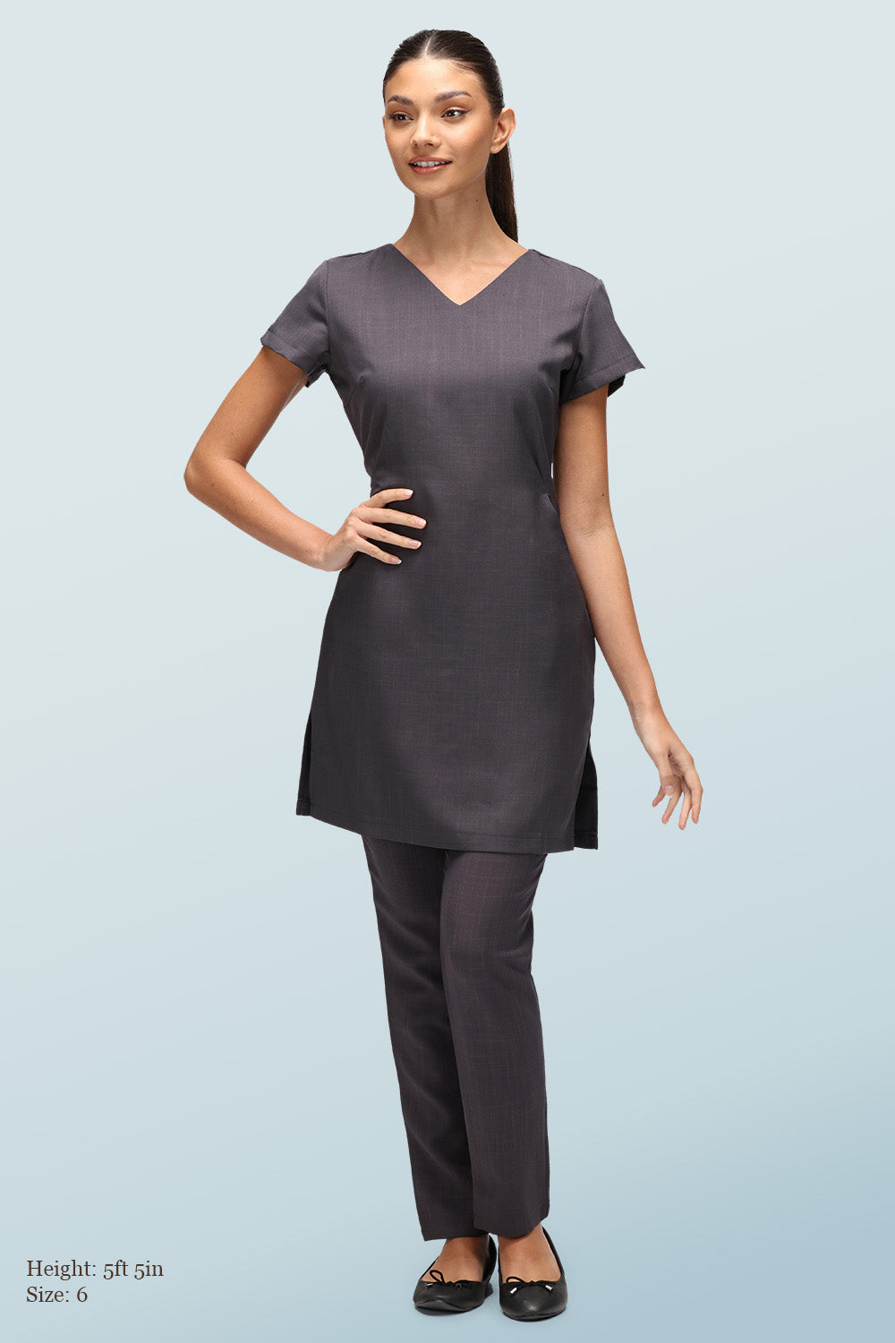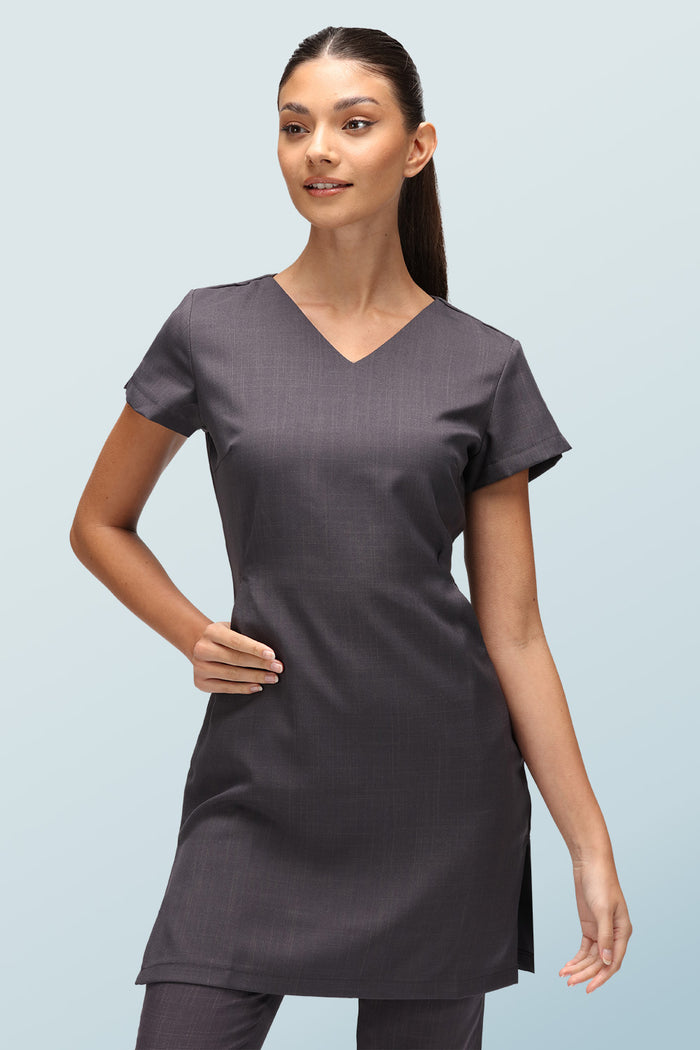 This sleek beauty and wellness tunic is designed with a longer length for modesty and confidence, featuring two handy side pockets for practicality and style. Effortlessly pair with either trousers or leggings for your perfect look.