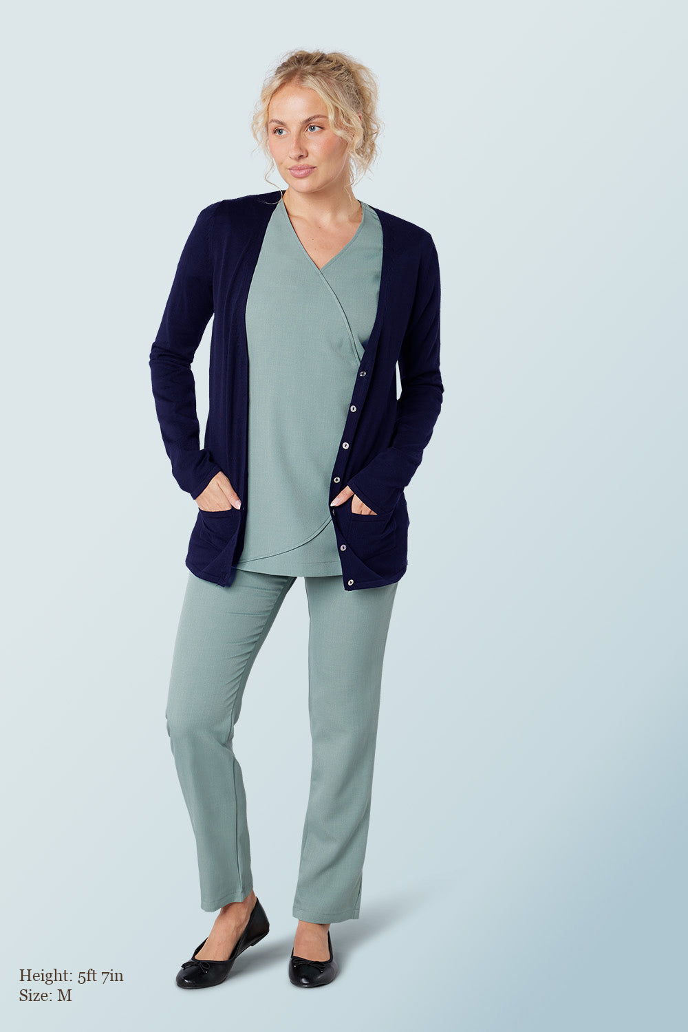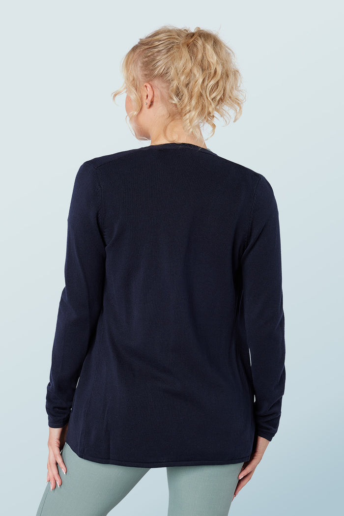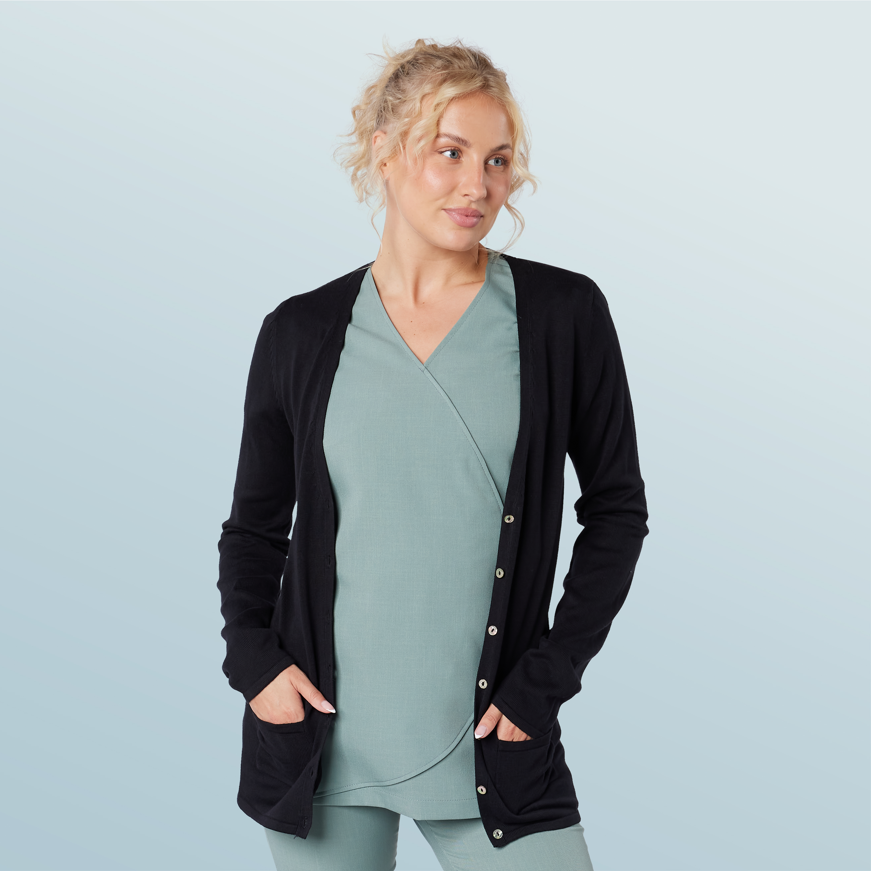This longer length work cardigan is versatile and beautifully soft, featuring a V-neck, pockets and faux pearl buttons. It’s perfect for layering over your uniform for warmth and comfort when you need it most. Choose from classic Black or Navy to perfectly compliment your uniform.