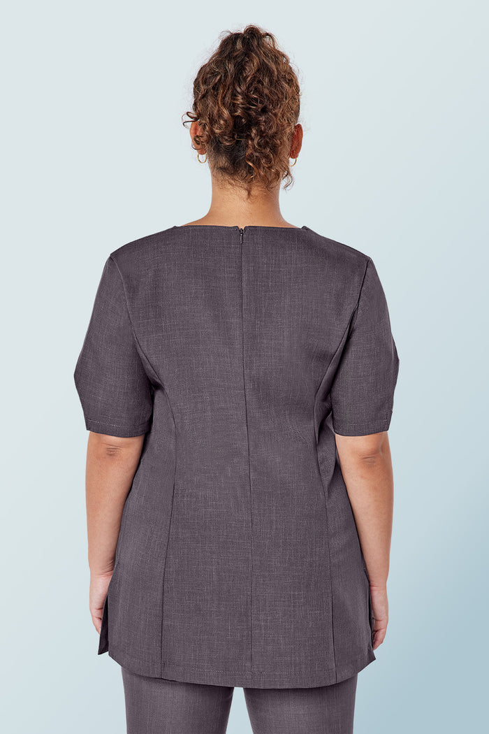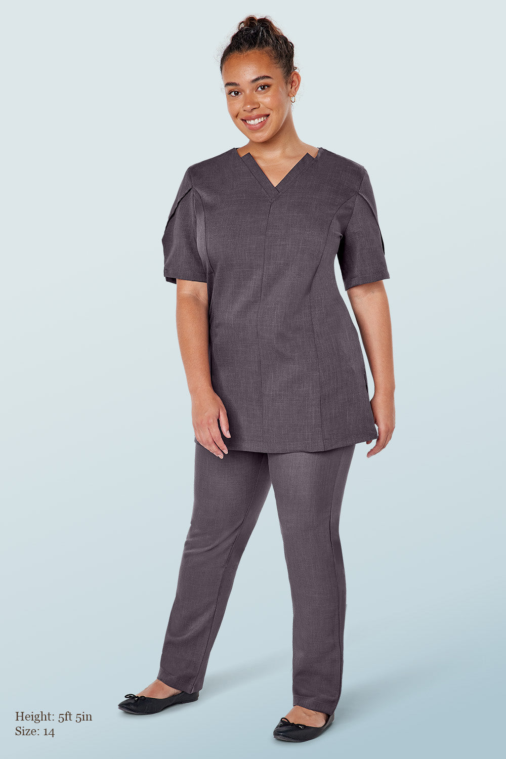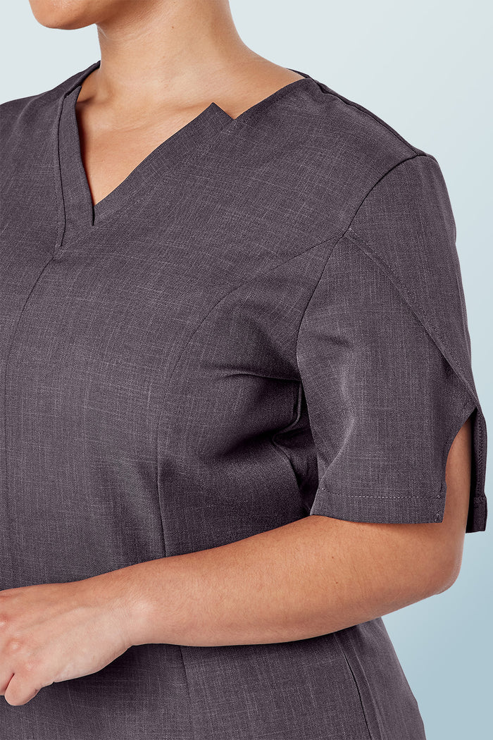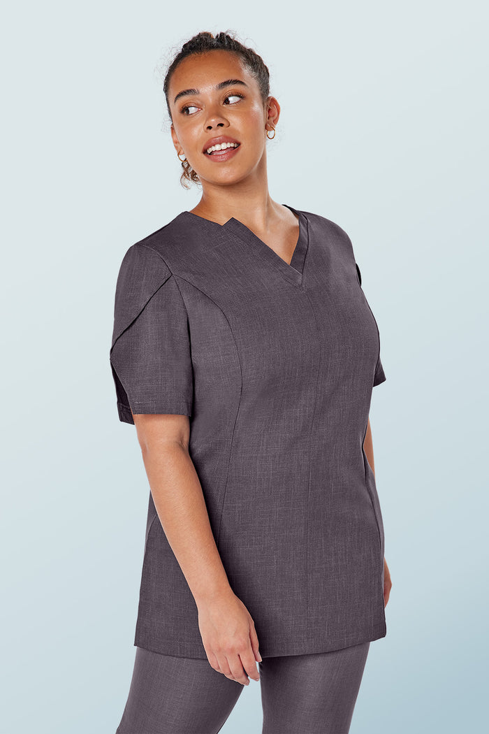 This innovative beauty and wellness tunic is designed with wrap-over sleeves for added arm coverage and ease or movement, featuring a contemporary update on a v-neckline for style and sophistication. Look as good as you feel, all shift long.