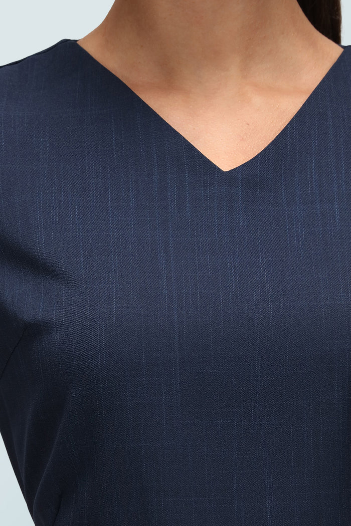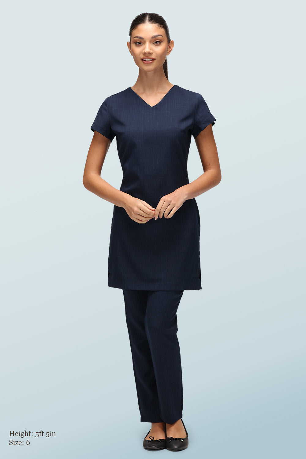 This sleek wellness and beauty tunic is designed with a longer length for modesty and confidence, featuring a flattering yet modest v-neckline for professionalism and sophistication. Effortlessly pair with either trousers or leggings for your perfect look.